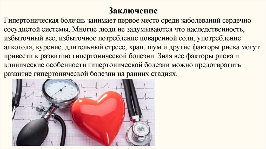 ЗаключениеГипертоническая болезнь занимает первое место среди заболеваний сердечно