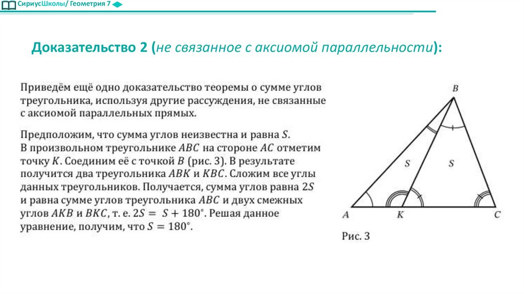 СириусШколы/ Геометрия 7Доказательство 2 (не связанное с аксиомой параллельности):