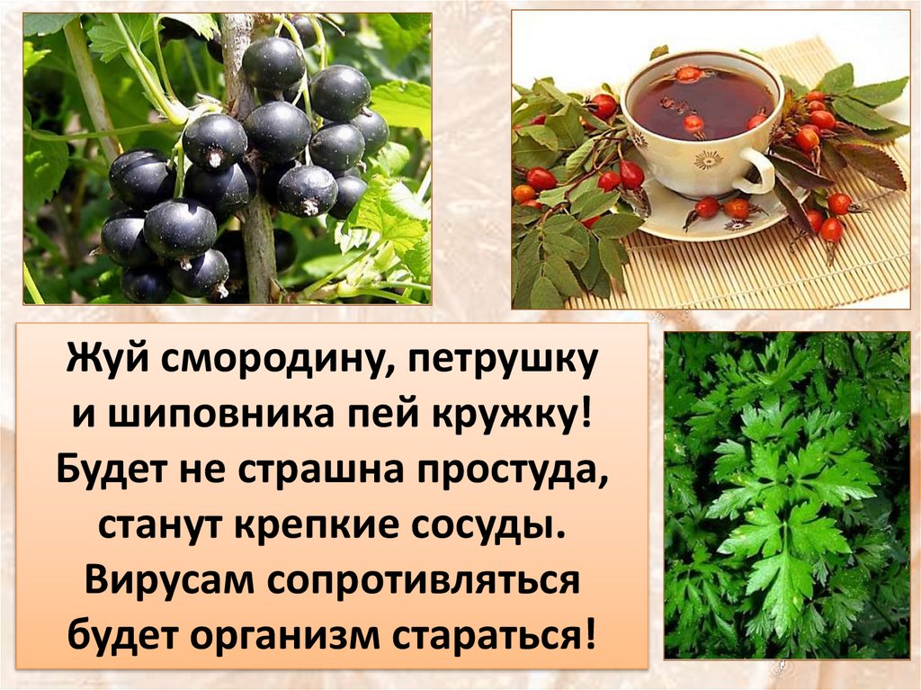 Жуй смородину, петрушкуи шиповника пей кружку!
