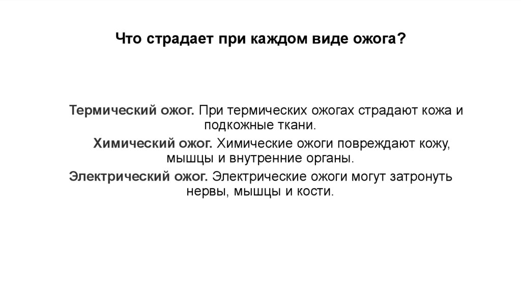 Что страдает при каждом виде ожога?Термический ожог. При термических ожогах страдают кожа и
