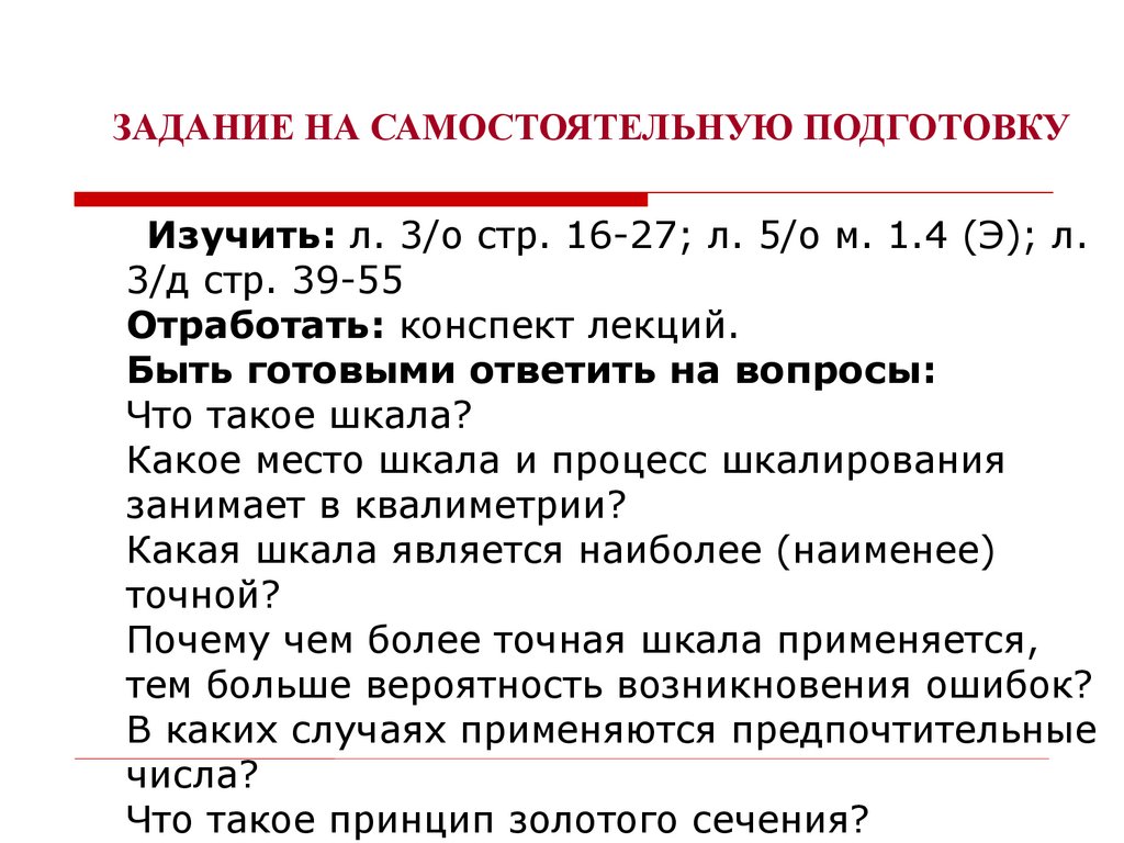 ЗАДАНИЕ НА САМОСТОЯТЕЛЬНУЮ ПОДГОТОВКУИзучить: л. 3/о стр. 16-27; л. 5/о м. 1.4 (Э); л.