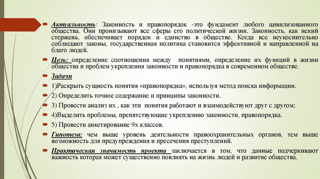 Актуальность: Законность и правопорядок -это фундамент любого цивилизованногообщества. Они пронизывают все сферы его политической жизни. Законность, как некий