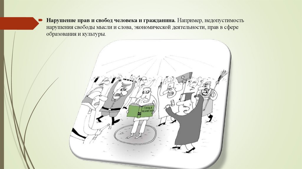 Нарушение прав и свобод человека и гражданина. Например, недопустимостьнарушения свободы мысли и слова, экономической деятельности, прав в сфере