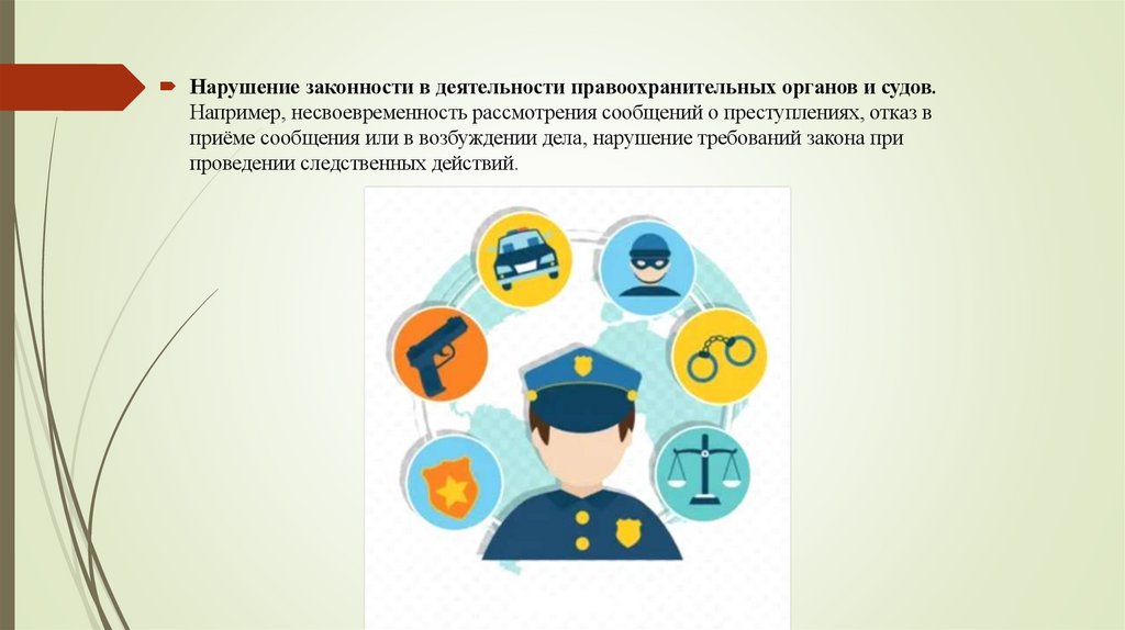 Нарушение законности в деятельности правоохранительных органов и судов.Например, несвоевременность рассмотрения сообщений о преступлениях, отказ в