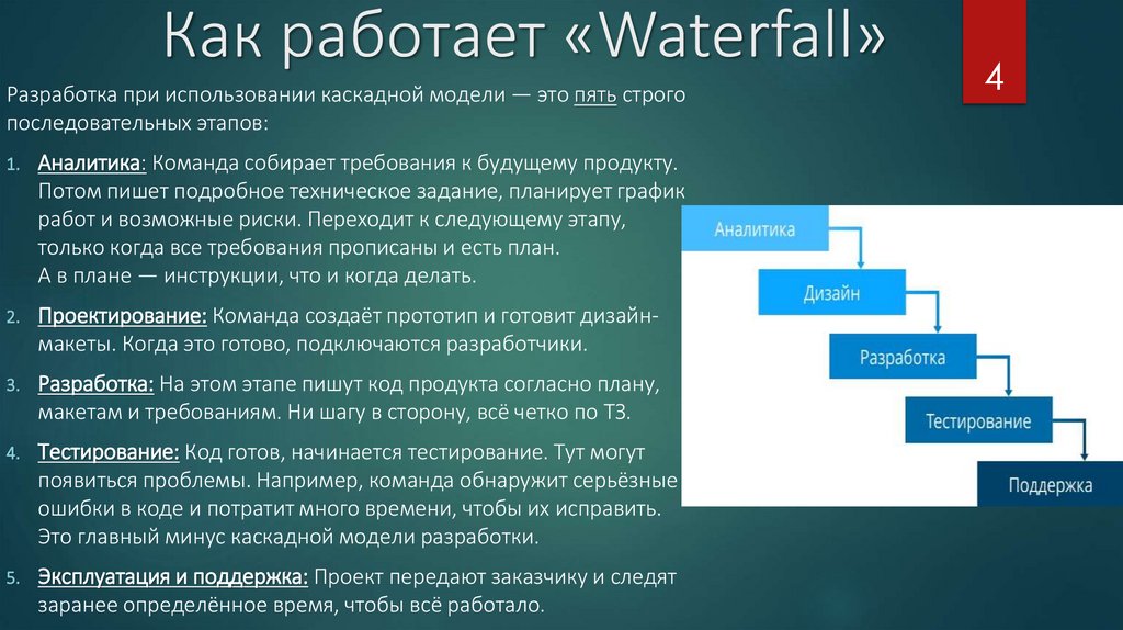 Как работает «Waterfall»Разработка при использовании каскадной модели — это пять строго