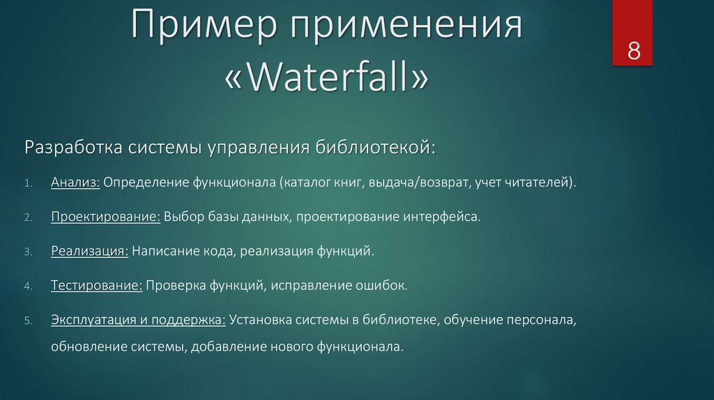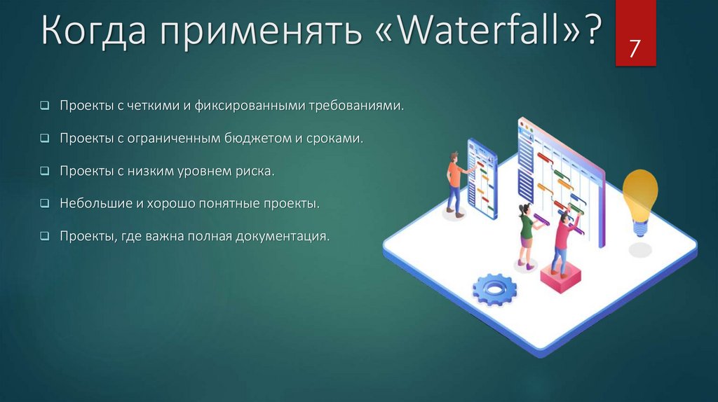 Когда применять «Waterfall»? 7Проекты с четкими и фиксированными требованиями.