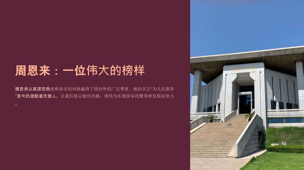 周恩来 一位伟大的榜样周恩来以其深思熟虑和务实的风格赢得了国内外的广泛尊重。他的名言“为人民服务