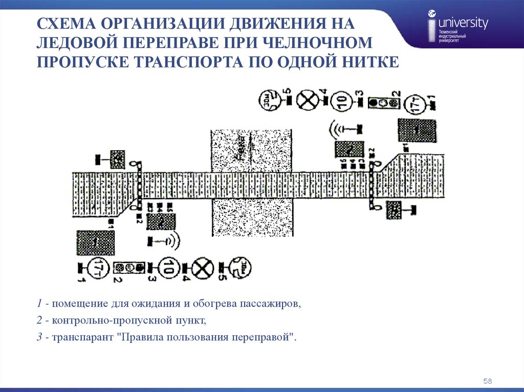 58. Схема организации движения на ледовой переправе при челночном пропуске транспорта по одной нитке
