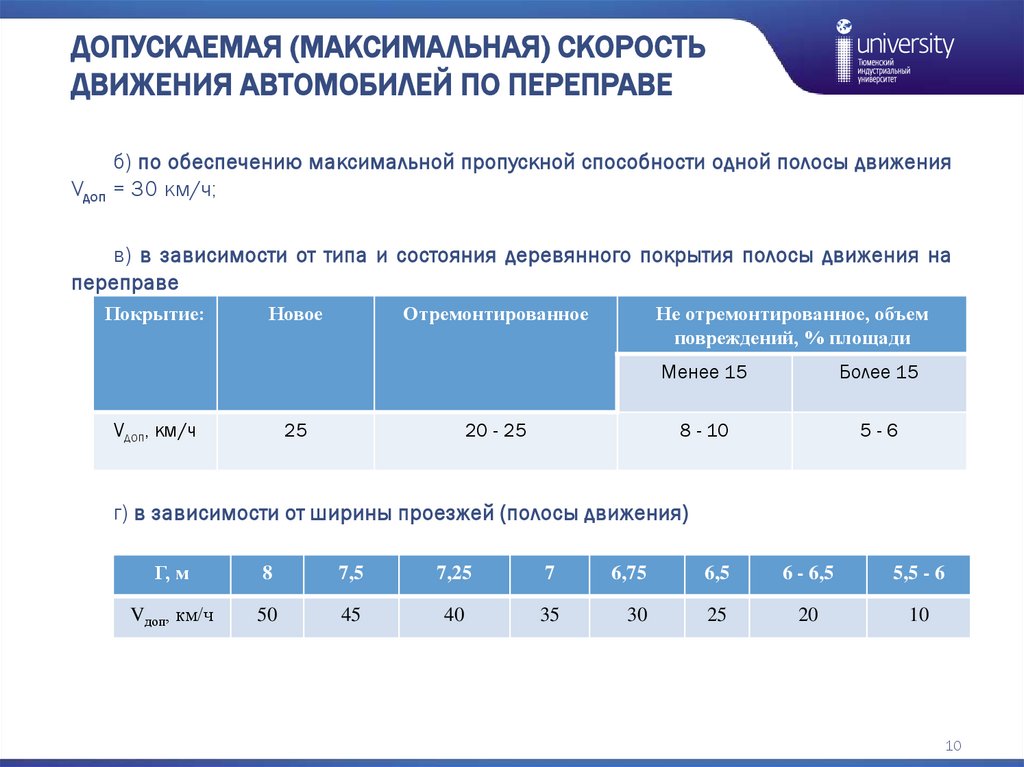 ДОПУСКАЕМАЯ (МАКСИМАЛЬНАЯ) СКОРОСТЬДВИЖЕНИЯ АВТОМОБИЛЕЙ ПО ПЕРЕПРАВЕ