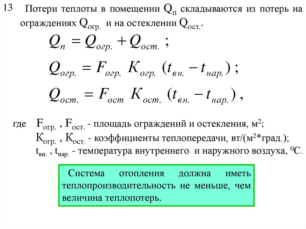 13Потери теплоты в помещении Qп складываются из потерь на