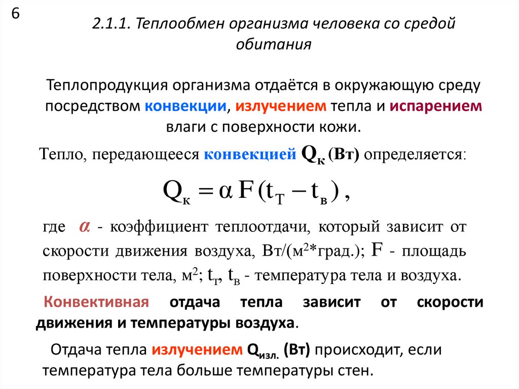 поверхности тела, м2; tт, tв - температура тела и воздуха.