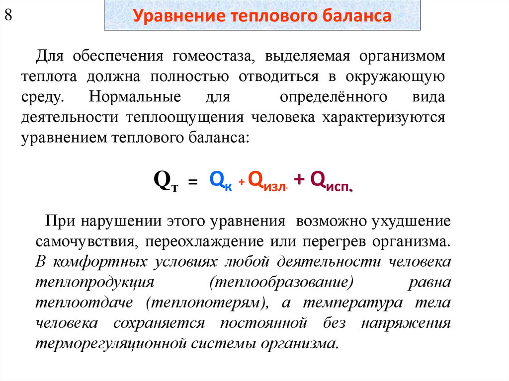 Гипертермия (перегрев) наблюдается при нарушении уравнения