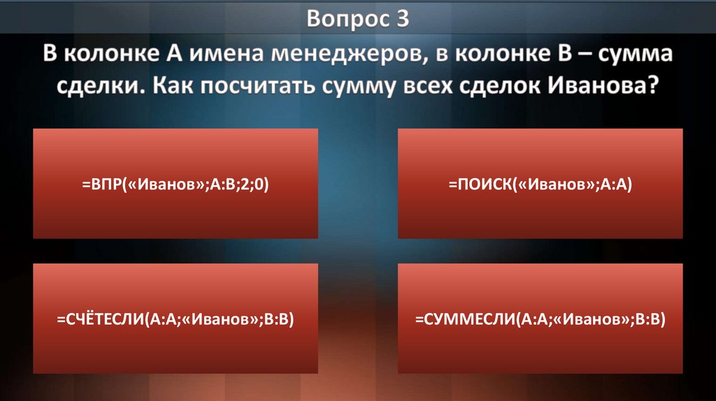 =ВПР(«Иванов»;A:B;2;0)=ПОИСК(«Иванов»;A:A)
