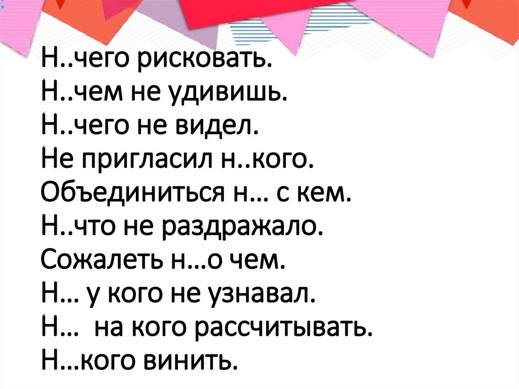Записать:2. Н..чего рисковать. Н..чем не удивишь. Н..чего не видел. Не пригласил н..кого. Объединиться н… с кем. Н..что не раздражало.