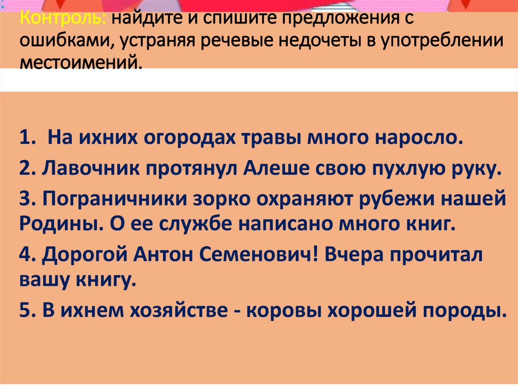 17. Контроль: найдите и спишите предложения с ошибками, устраняя речевые недочеты в употреблении местоимений.