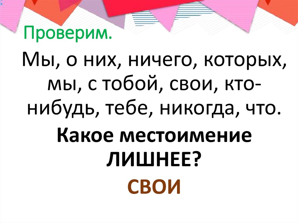 Мы, о них, ничего, которых,мы, с тобой, свои, ктонибудь, тебе, никогда, что.