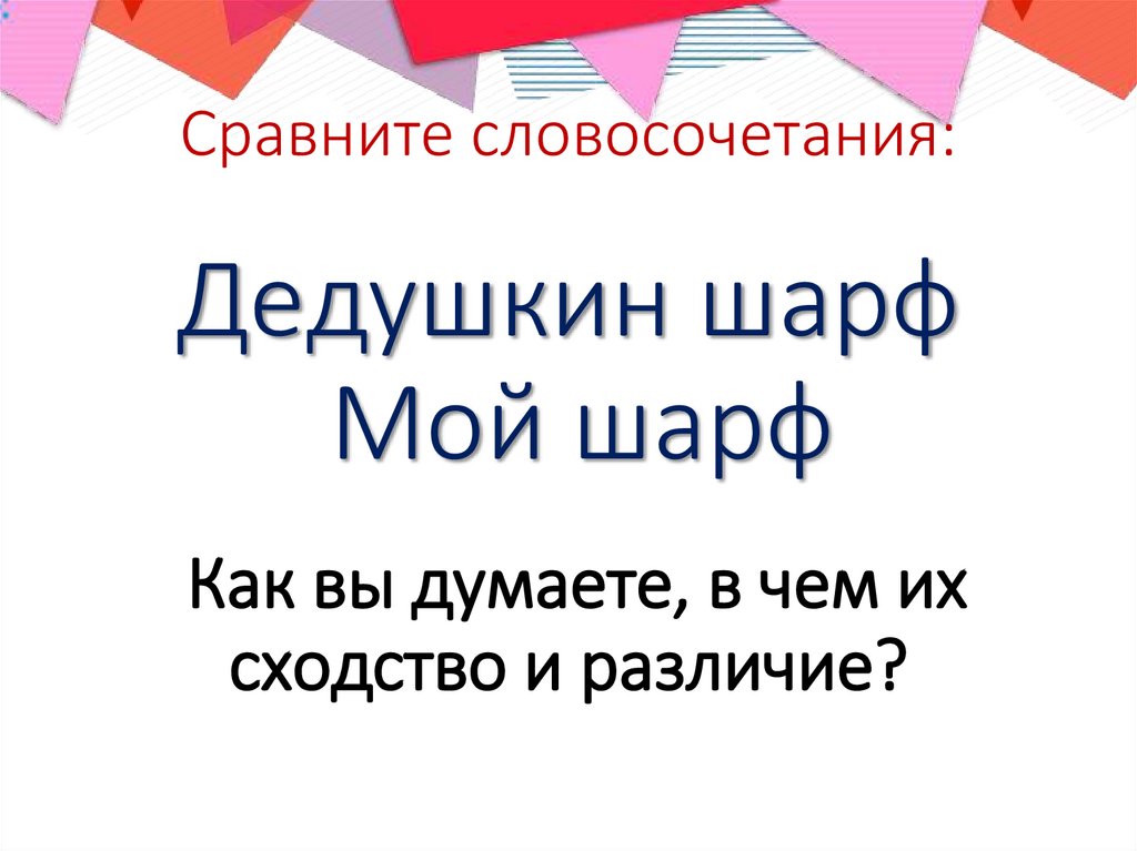 10. Сравните словосочетания: Дедушкин шарф Мой шарф Как вы думаете, в чем их сходство и различие?