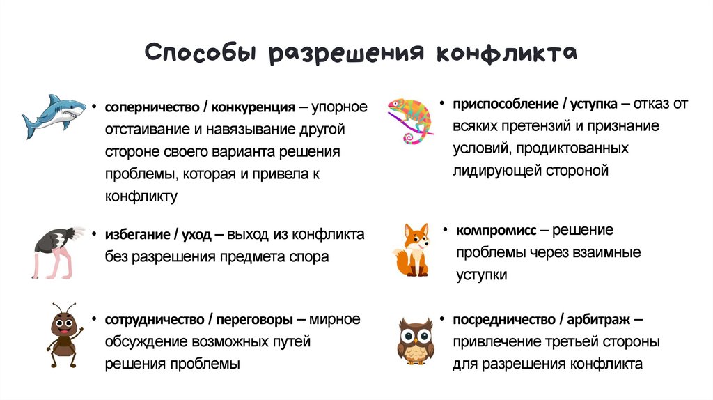 • приспособление – отказ от отстаивания собственных интересов и подчинение