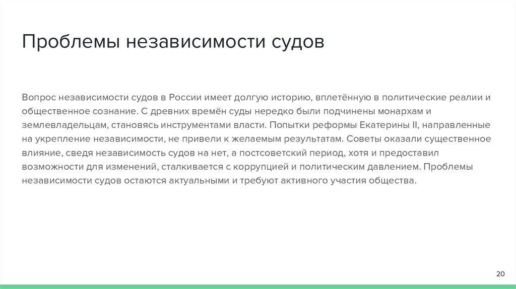 Проблемы независимости судовВопрос независимости судов в России имеет долгую историю, вплетённую в политические реалии и