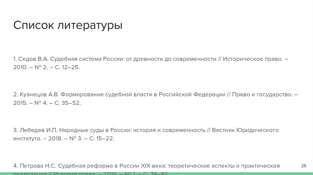 Список литературы1. Седов В.А. Судебная система России: от древности до современности // Историческое право. –