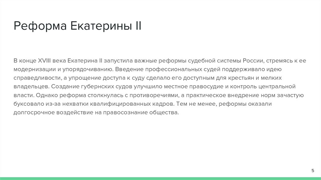 Реформа Екатерины IIВ конце XVIII века Екатерина II запустила важные реформы судебной системы России, стремясь к ее