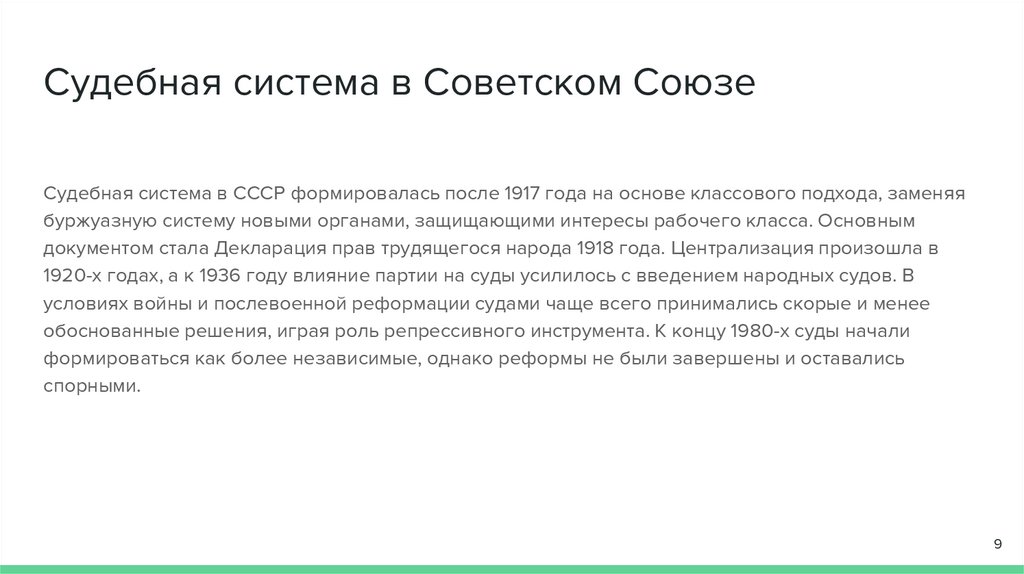 Судебная система в Советском СоюзеСудебная система в СССР формировалась после 1917 года на основе классового подхода, заменяя