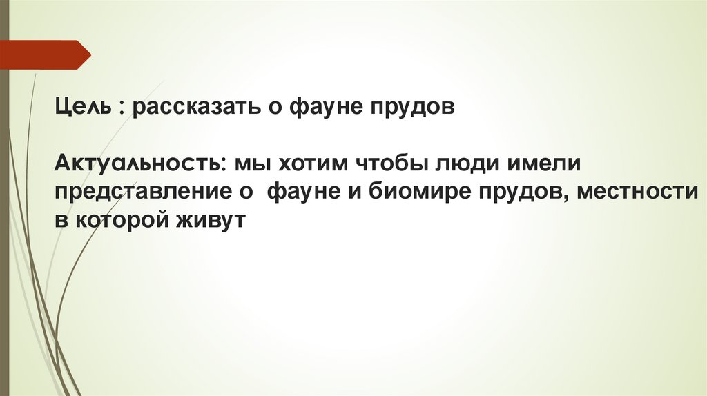 Цель : рассказать о фауне прудовАктуальность: мы хотим чтобы люди имели