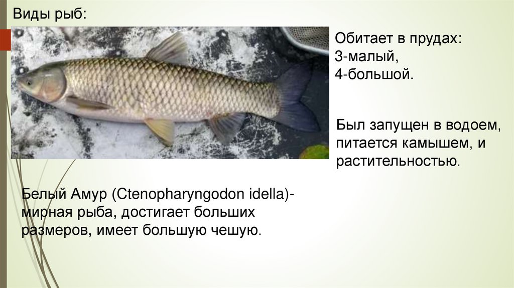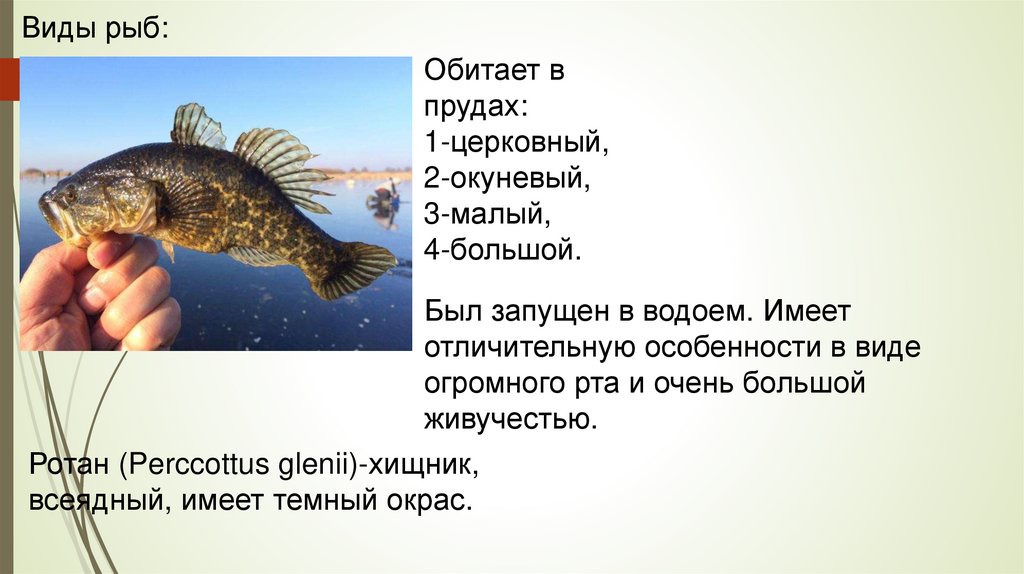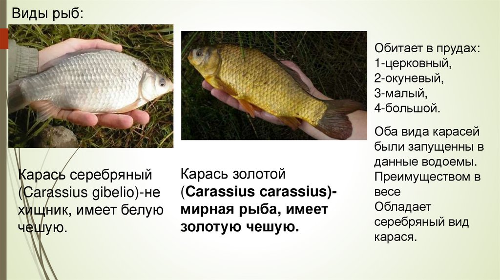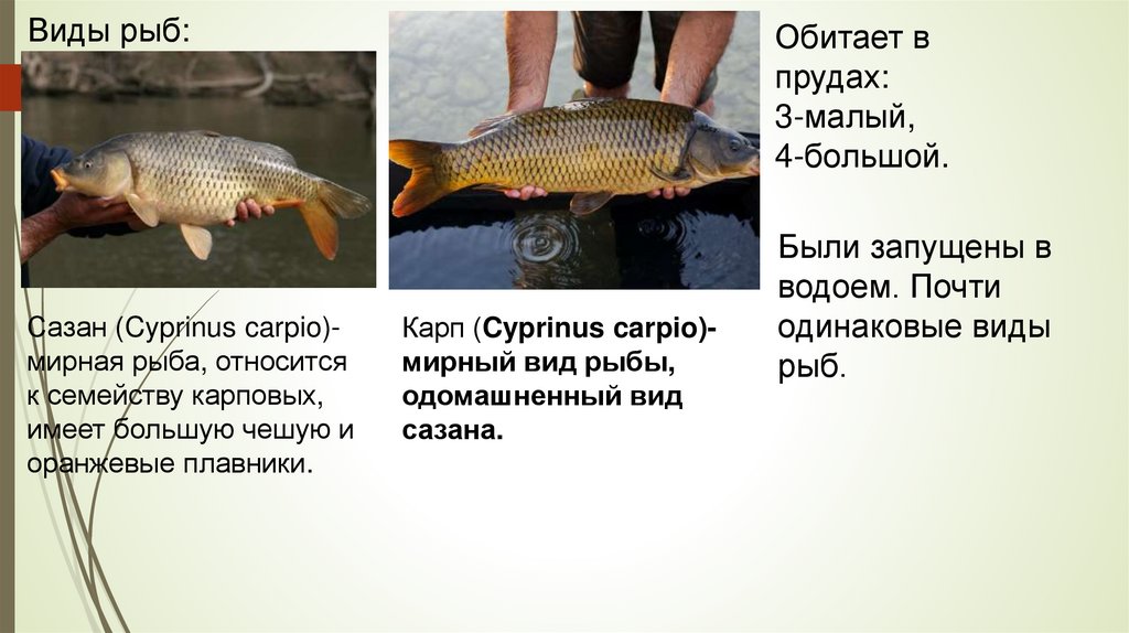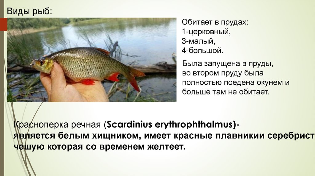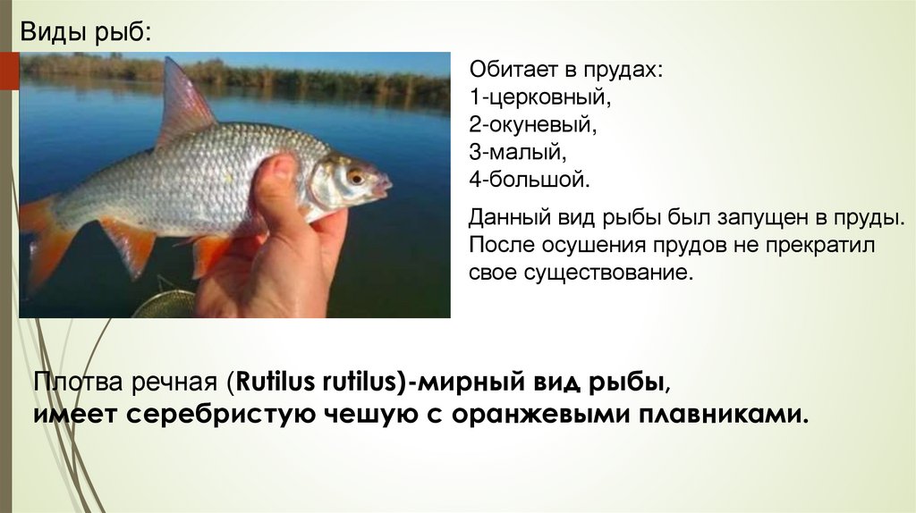 Виды рыб:Обитает в прудах: