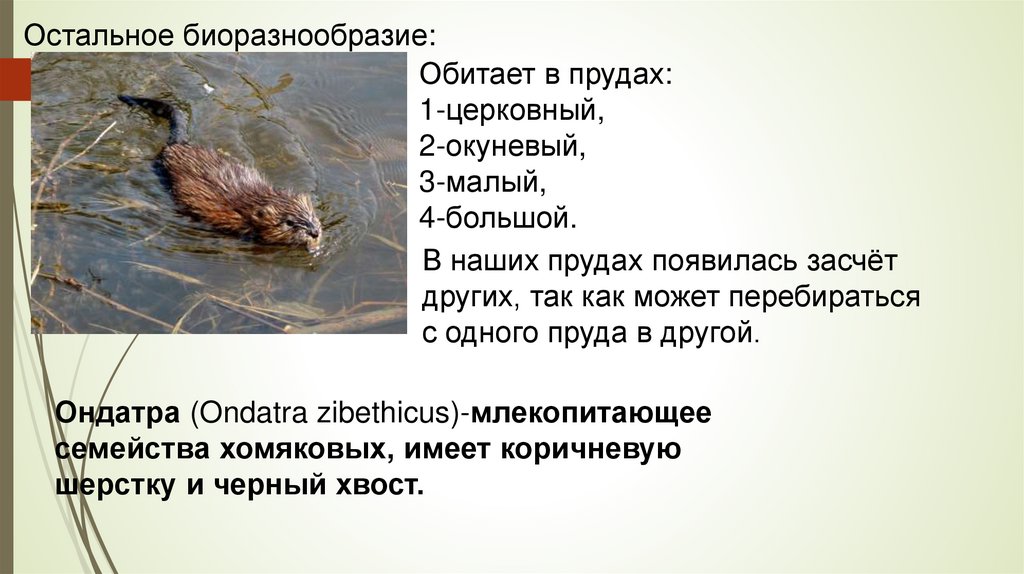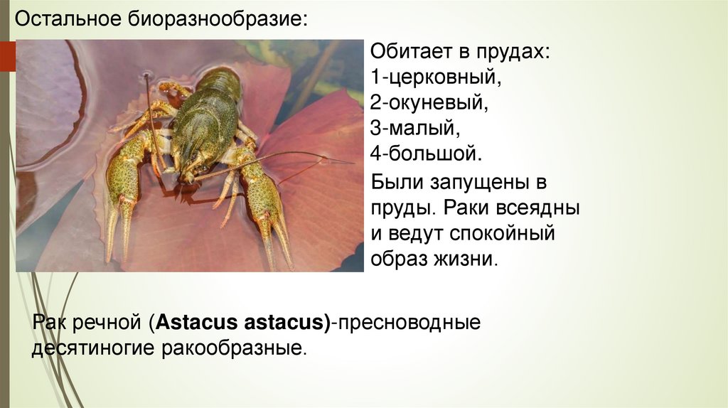 Остальное биоразнообразие:Обитает в прудах:
