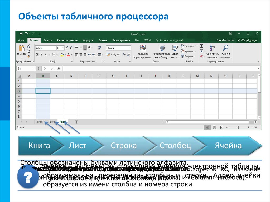 лист, электронная таблица, строка, столбец и ячейка. Ячейка –