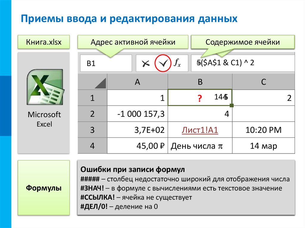 операций, функции, ссылки на ячейки. В формулах используются ссылки