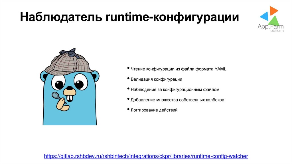 Наблюдатель runtime-конфигурации• Чтение конфигурации из файла формата YAML