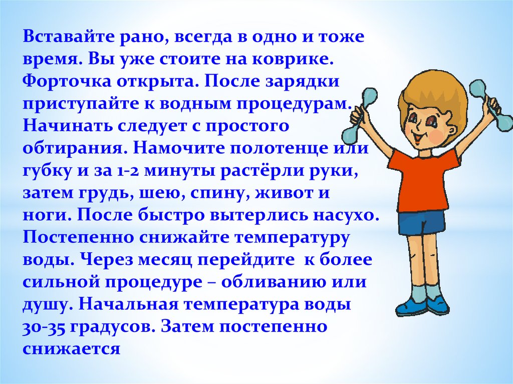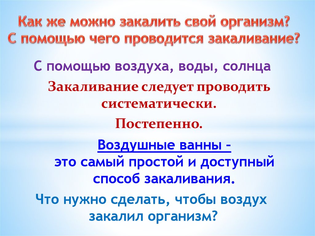 С помощью воздуха, воды, солнцаЗакаливание следует проводить