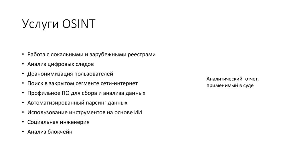 Услуги OSINT• Работа с локальными и зарубежными реестрами