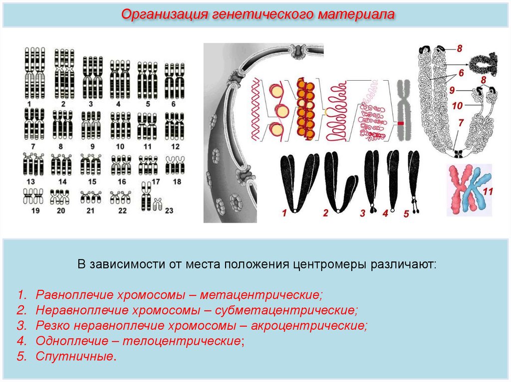 Организация генетического материалаВ зависимости от места положения центромеры различают: