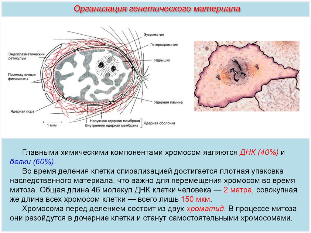Организация генетического материалаГлавными химическими компонентами хромосом являются ДНК (40%) и