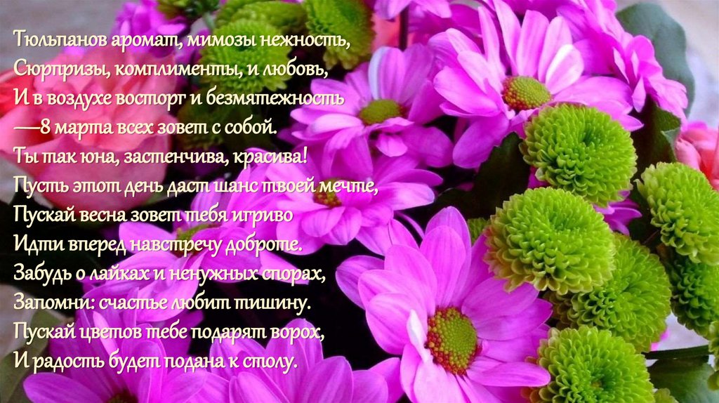 Тюльпанов аромат, мимозы нежность,Сюрпризы, комплименты, и любовь,