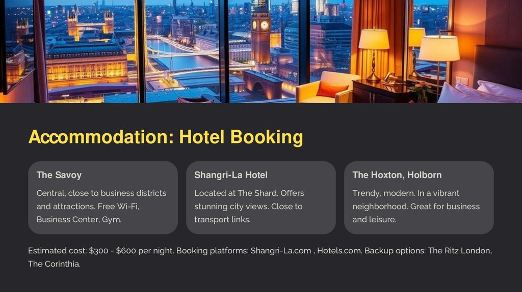 Estimated cost: $300 - $600 per night. Booking platforms: Shangri-La.com , Hotels.com. Backup options: The Ritz London,