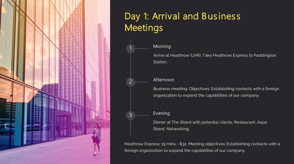 Heathrow Express: 15 mins, ~$32. Meeting objectives: Establishing contacts with a