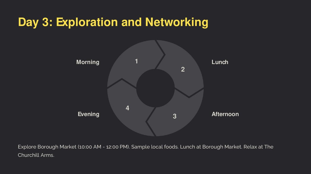Explore Borough Market (10:00 AM - 12:00 PM). Sample local foods. Lunch at Borough Market. Relax at The