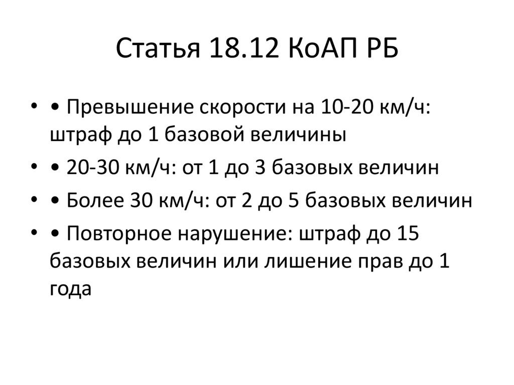 Статья 18.12 КоАП РБ• • Превышение скорости на 10-20 км/ч: