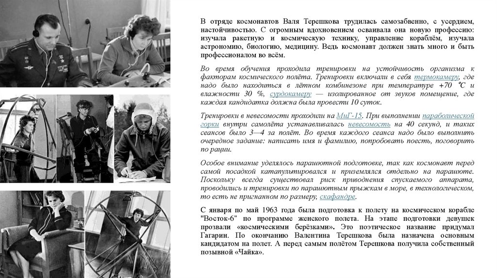 В отряде космонавтов Валя Терешкова трудилась самозабвенно, с усердием,настойчивостью. С огромным вдохновением осваивала она новую профессию: