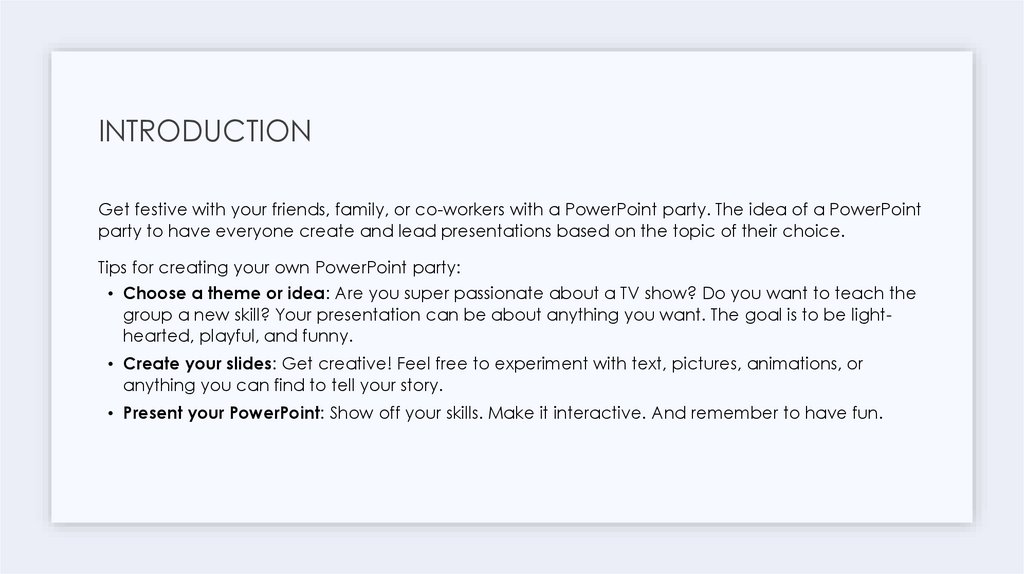 INTRODUCTIONGet festive with your friends, family, or co-workers with a PowerPoint party. The idea of a PowerPoint