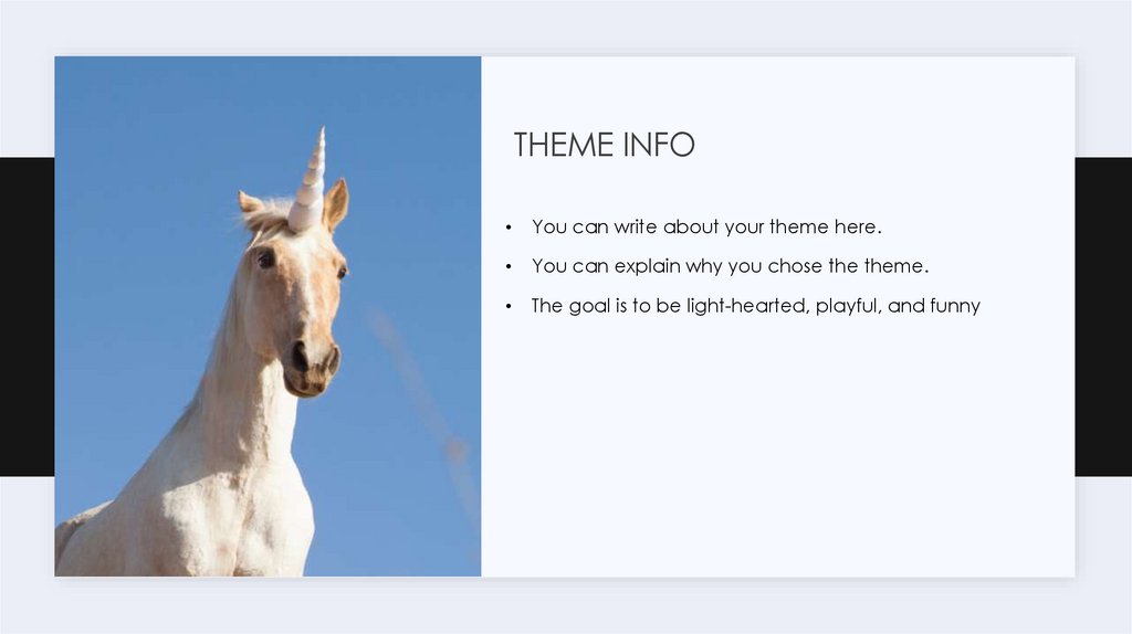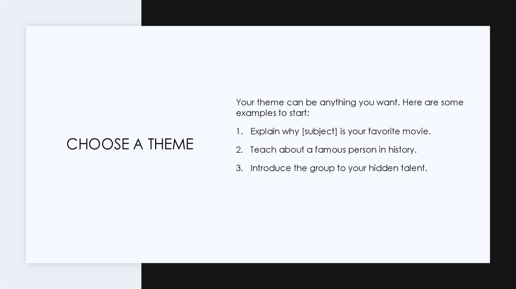 group a new skill? Your presentation can be about anything you want. The goal is to be lighthearted, playful, and funny.