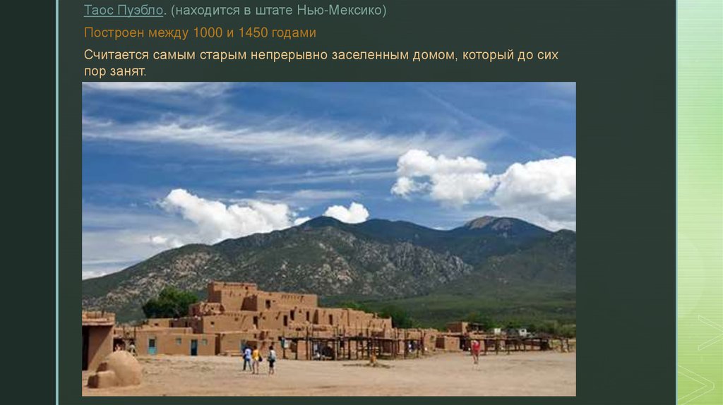 Таос Пуэбло. (находится в штате Нью-Мексико)Построен между 1000 и 1450 годами