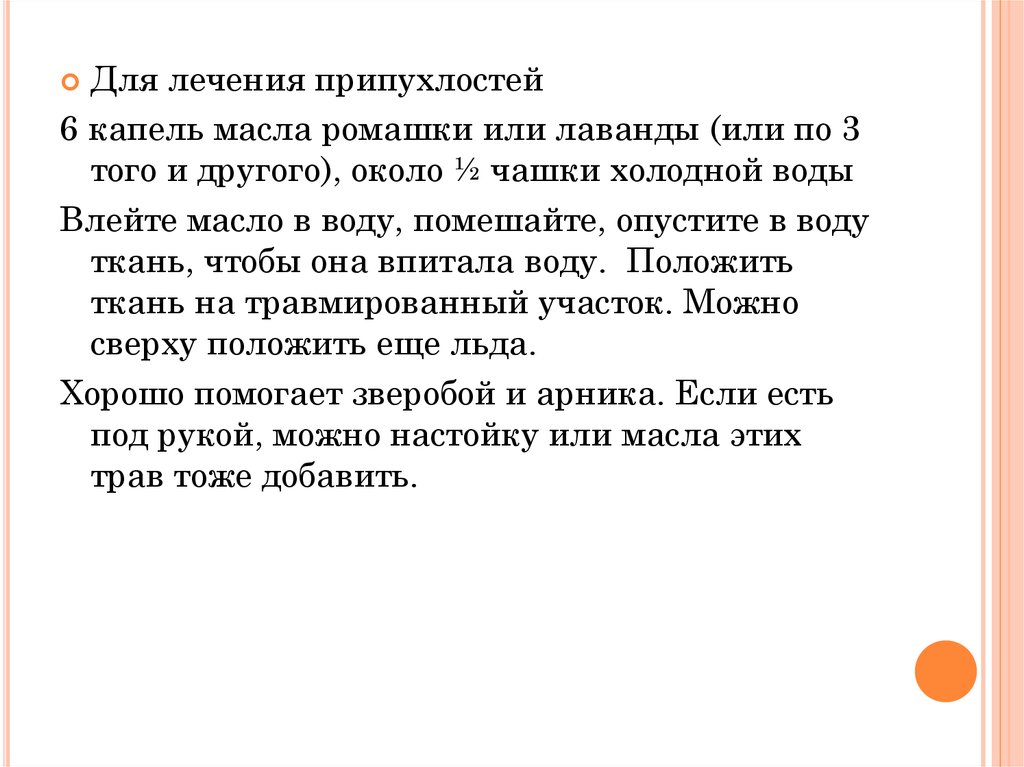 Для лечения припухлостей6 капель масла ромашки или лаванды (или по 3