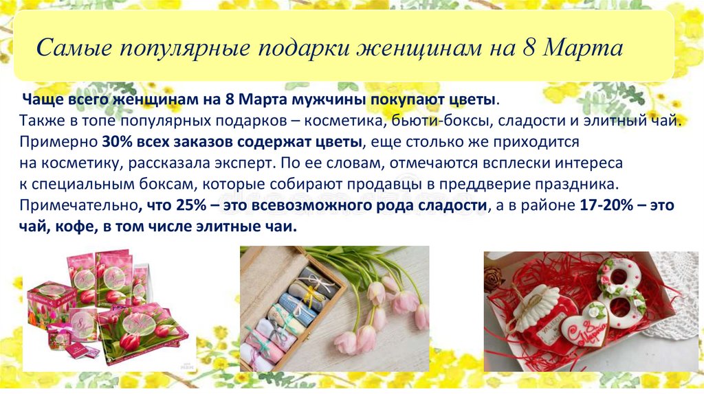 Также в топе популярных подарков – косметика, бьюти-боксы, сладости и элитный чай.