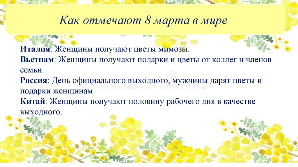 Как отмечают 8 марта в миреИталия: Женщины получают цветы мимозы.