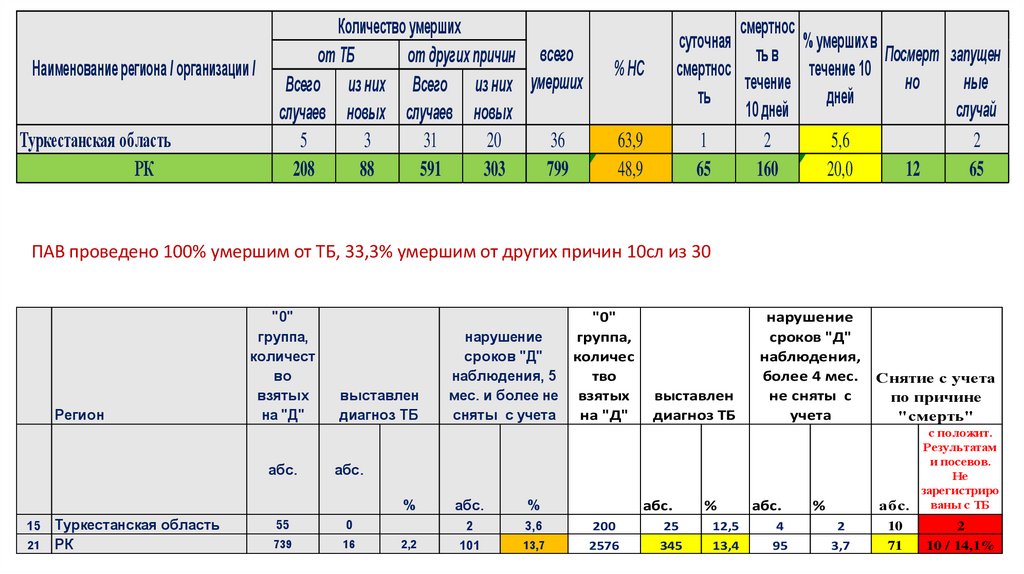 ПАВ проведено 100% умершим от ТБ, 33,3% умершим от других причин 10сл из 30