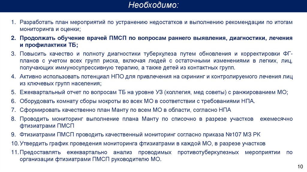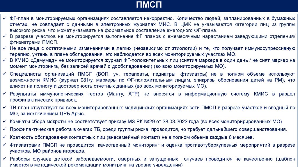 9. Фтизиатрами ПМСП проводить качественный мониторинг согласно приказа №107 МЗ РК